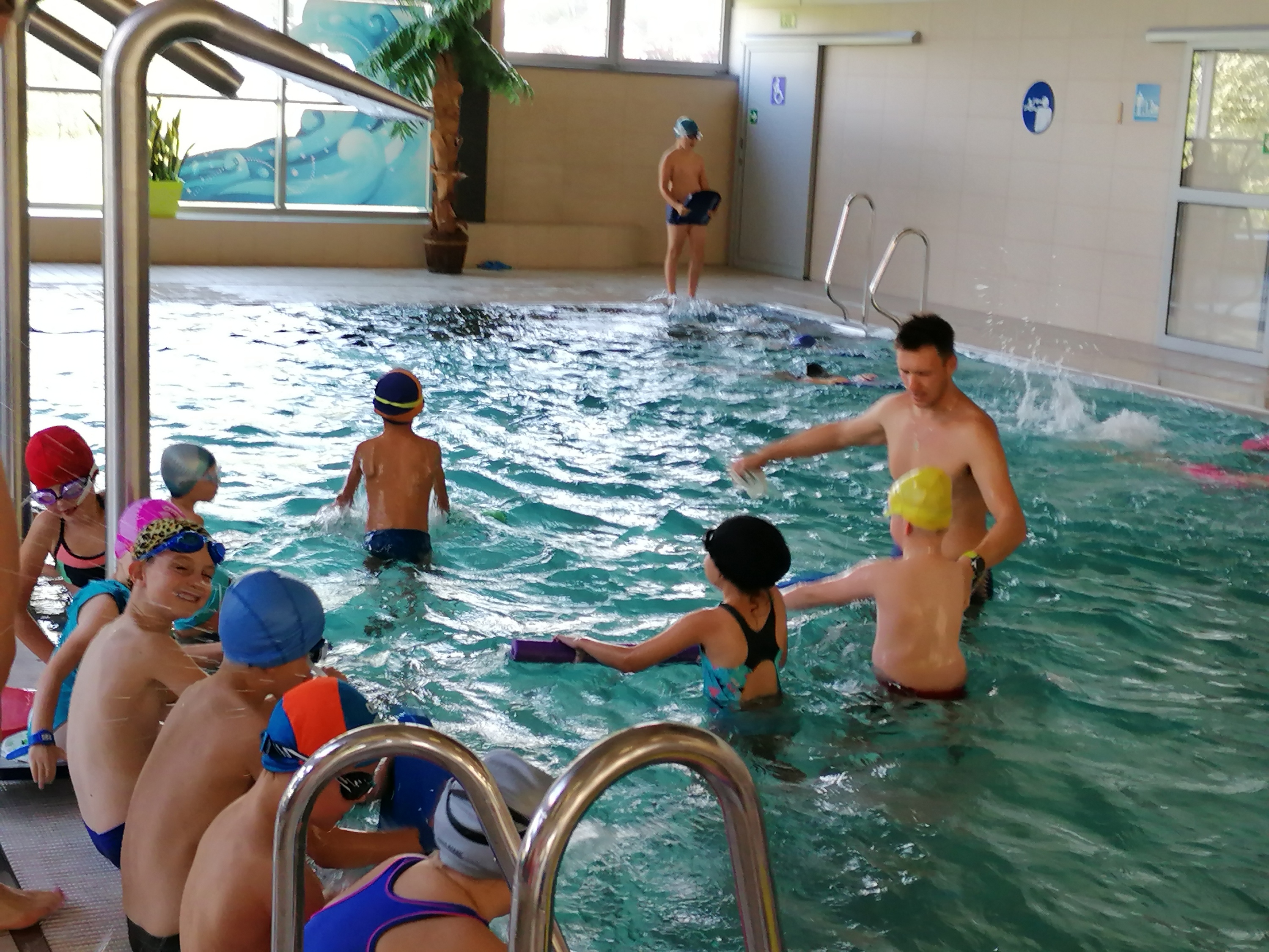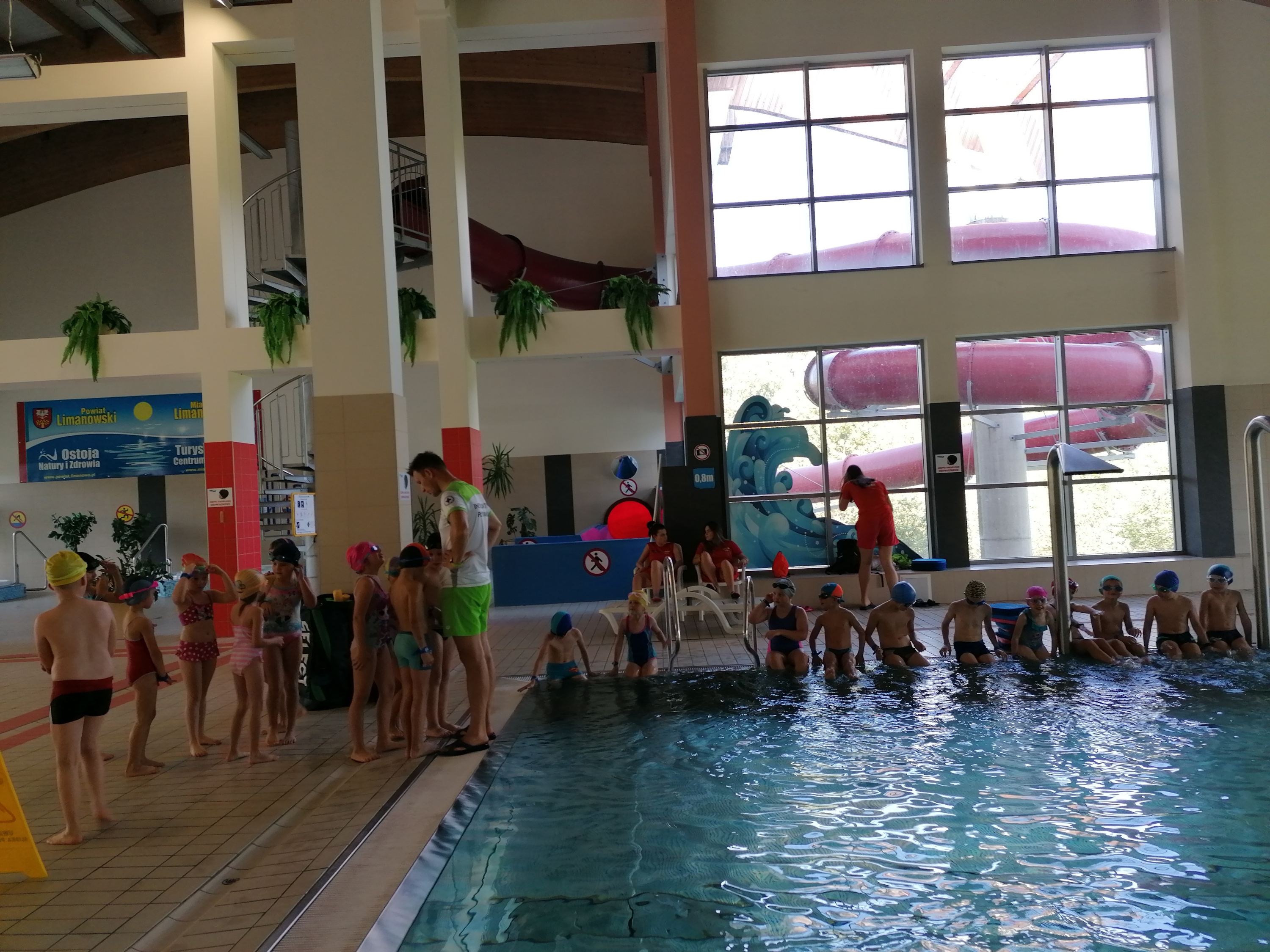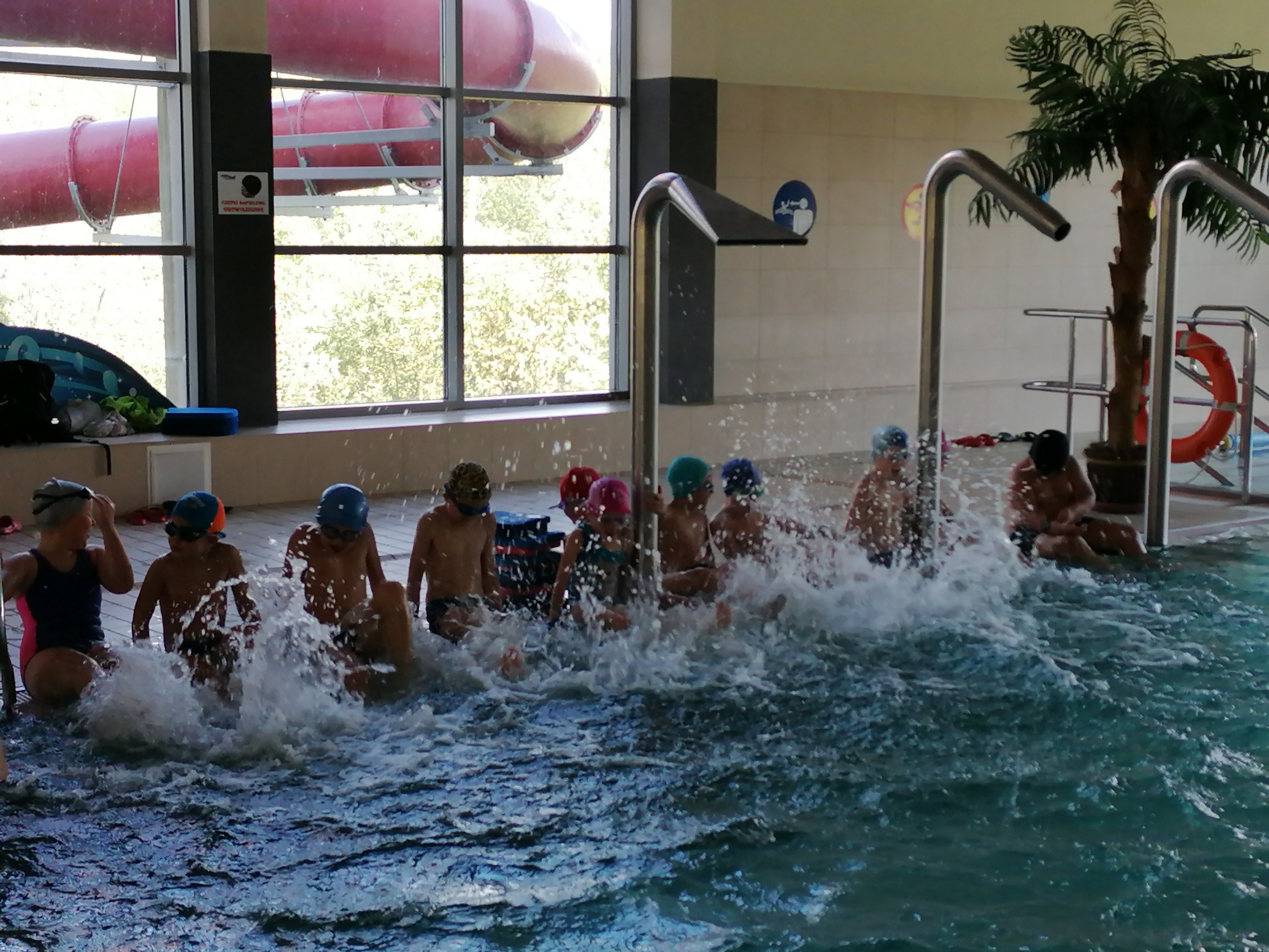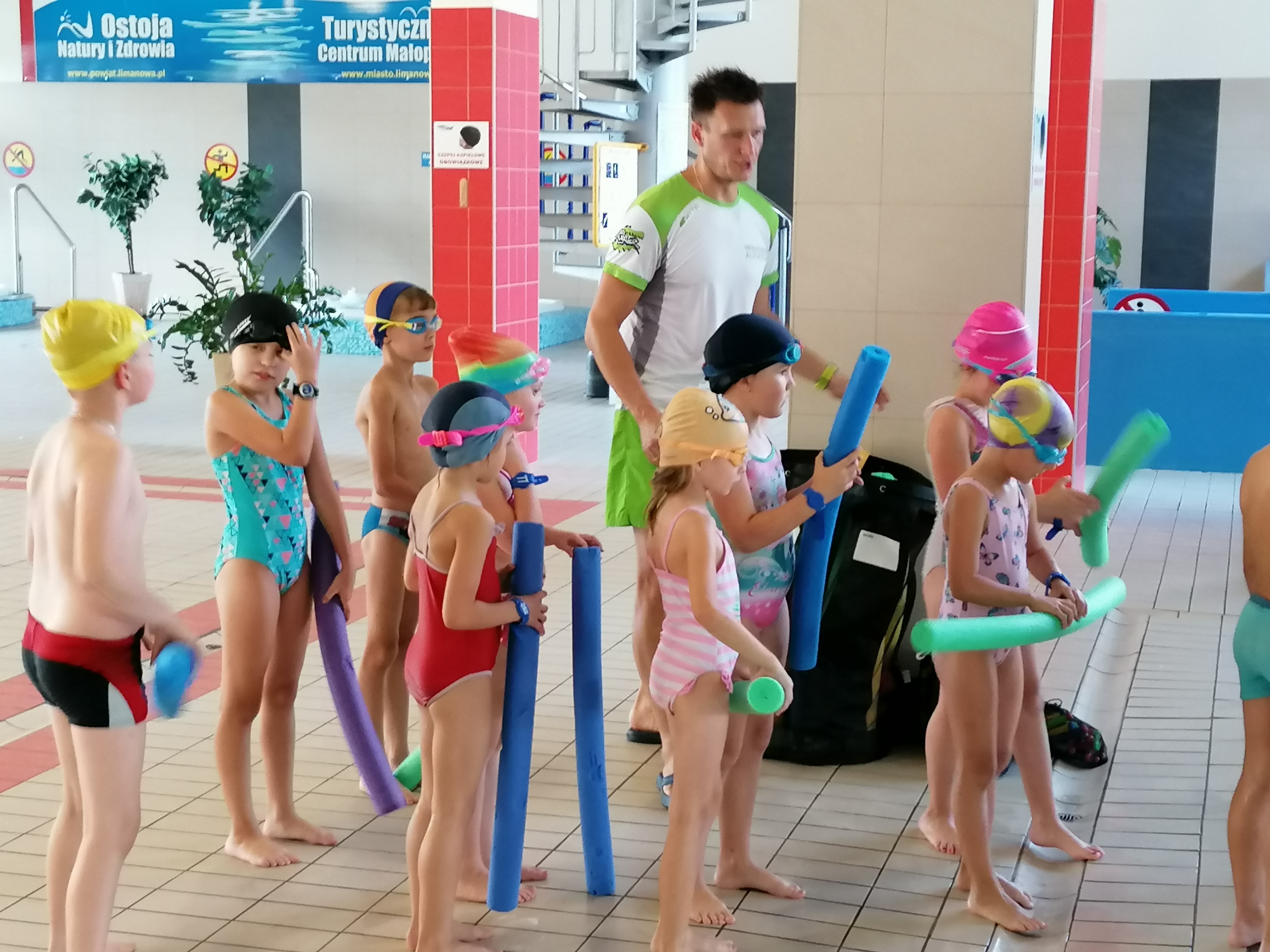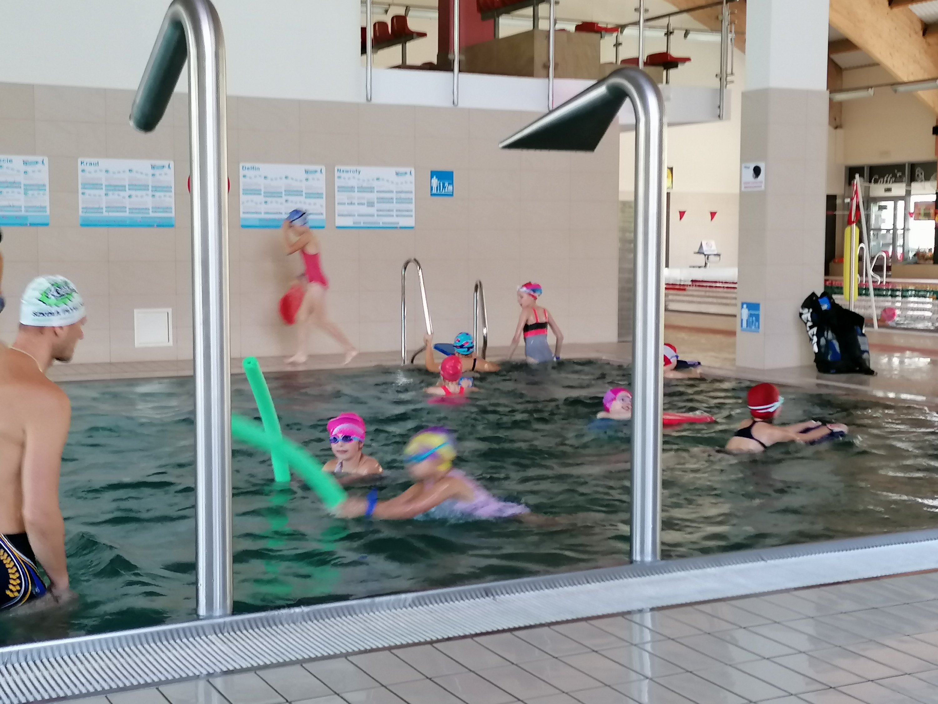 Dzieci bardzo chętnie wyjeżdżają na basen do Limanowej. Ćwiczą tam umiejętności pływania pod okiem trzech wspaniałych instruktorów. Pierwszy raz na basenie byliśmy w marcu tego roku, ale ze względu na pandemię wyjazdy zostały zawieszone. Obecnie kontynuujemy naukę pływania. Terminy wyjazdów: 21, 28.09.2020r., 05,12,19,26.10.2020r., 09,16,23.11.2020r.