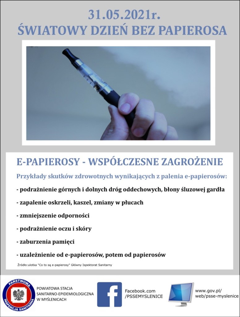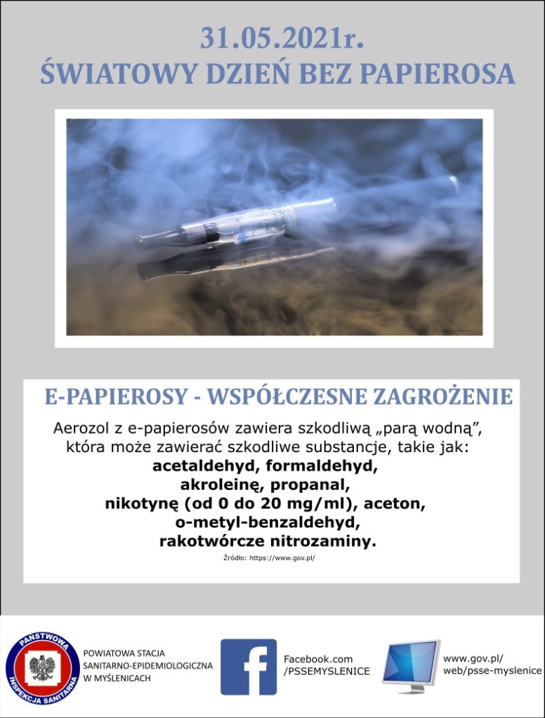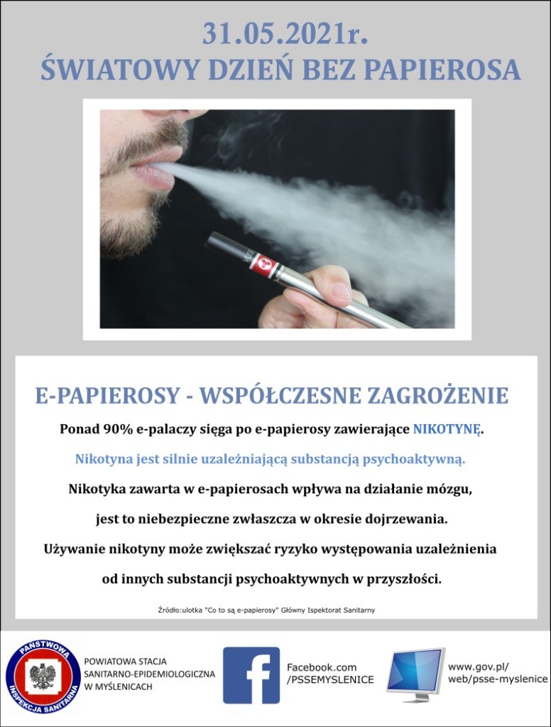 DLA RODZICA, DLA UCZNIA, PROFILAKTYKA 31.05.2021 – Światowy Dzień Bez Papierosa Opublikował/a bibliotekagruszow dnia 31 Maj 20211 czerwca 2021 31.05.2021r. obchodzimy ŚWIATOWY DZIEŃ BEZ TYTONIU/PAPIEROSA promowany co roku przez Światową Organizację Zdrowia (WHO). W tym roku kładziemy nacisk na niebezpieczeństwa związane z paleniem e-papierosów. Udostępnij: Kliknij, aby udostępnić na Facebooku (Otwiera się w nowym oknie) Facebook Kliknij, aby wysłać odnośnik e-mailem do znajomego (Otwiera się w nowym oknie) E-mail Kliknij by wydrukować (Otwiera się w nowym oknie) Drukuj