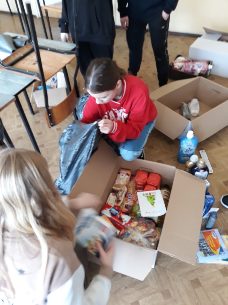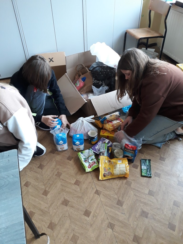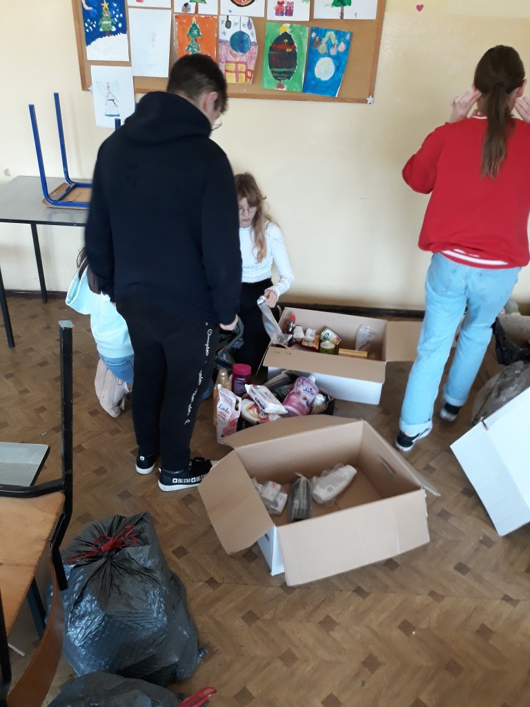 Społeczności naszej szkoły udało się zebrać 6 paczek żywnościowych i 3 paczki z artykułami chemii gospodarczej, które trafiły do punktu zbiórki w Myślenicach.